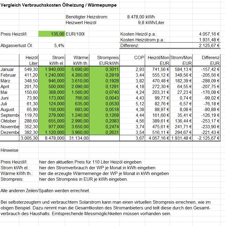 Hier kann man eine Excel-Tabelle herunterladen, mit deren Hilfe man den Energieverbrauch einer Wärmepumpe mit dem einer Ölheizung vergleichen kann.